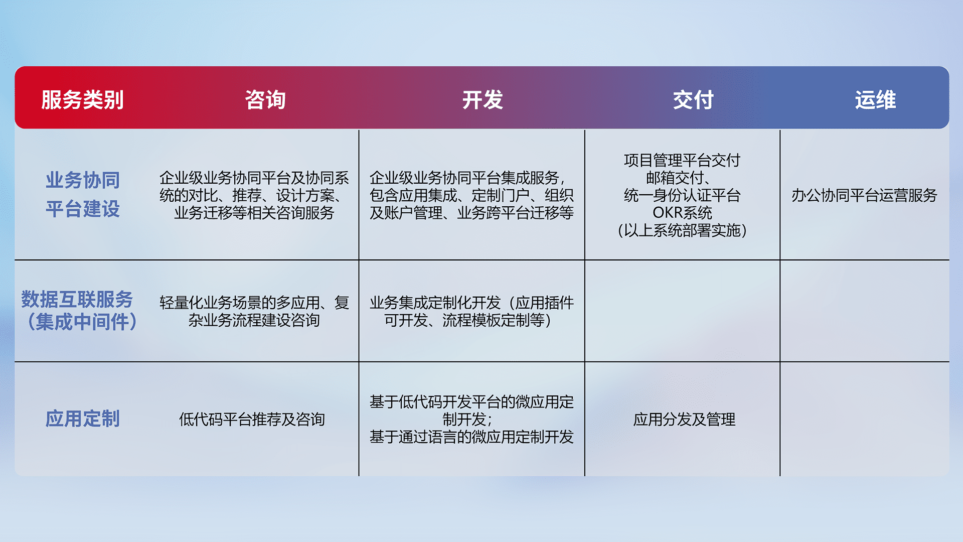 针对钉钉、、企微、、、、IDaas等平台级产品提供产品的规划、、、、方案、、交付、、定制化开发等服务,,实现如统一协同办公、、智能客户服务、、混合会议管理、、、、智能数据查询、、、等业务场景,,,实现数字化转型。。